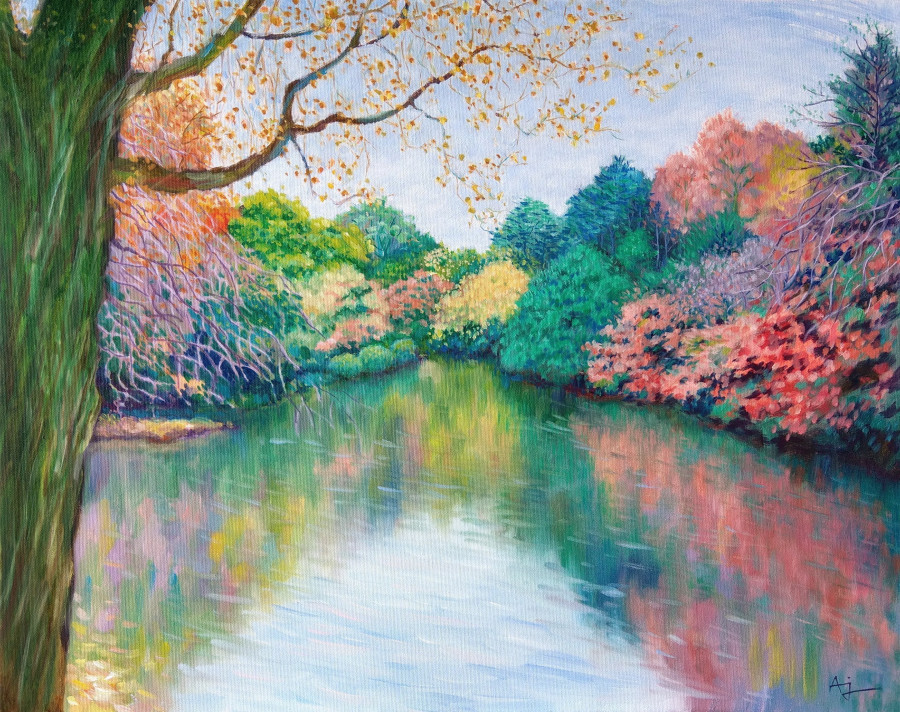 秋天總給人一種蕭瑟的感受,特別是對自小在台灣平地成長的我而言,四季的色彩似乎大同小異,直到有一年秋天去了趟東京,自此改變了我對秋天的印象。這幅作品的靈感來自新宿御苑裡的一處小水池,秋天把她染上了各種鮮明的色彩,池面上則閃爍著迷離倒影,樹木由左自右環抱式排列的構圖,彷彿秋神正展開雙手,熱情地歡迎我們享受這斑斕瑰麗的秋日風景。(註:已塗保護凡尼斯)