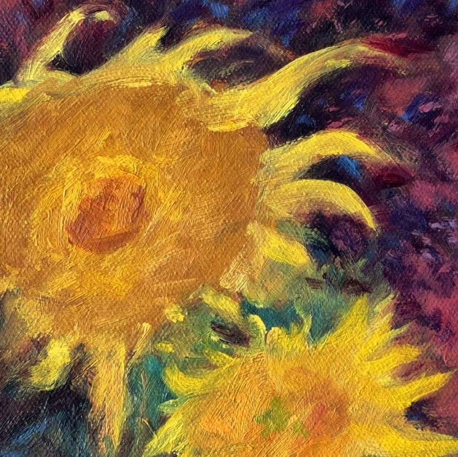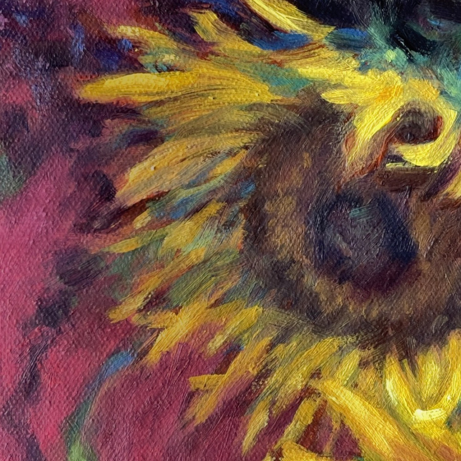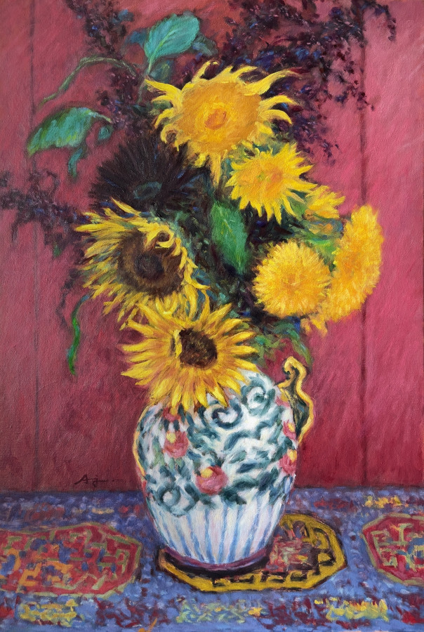 每當看到向日葵就會聯想到梵谷的畫作——亮黃色的花朵搭配淺黃、淺藍、淺綠色的背景,使畫面充滿張力。而這幅作品則用飽和度較低的紅色作為背景色,搭配一些紫色的花,讓向日葵和黃菊更為鮮活突出。此外,白色花瓶上的花紋和桌面上的圖騰紋路,更增添了整體畫面的活潑和豐富性。