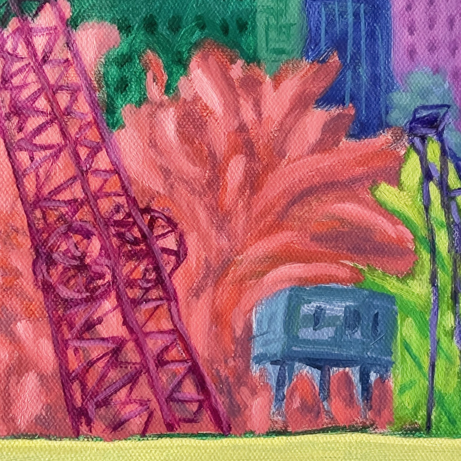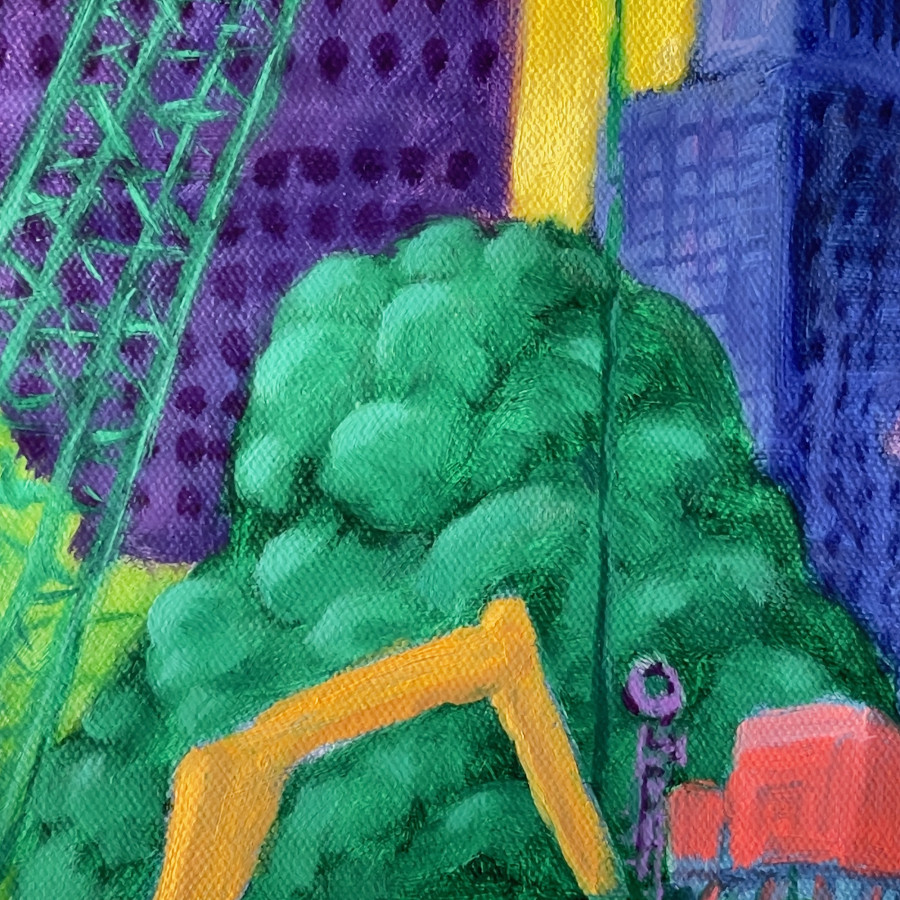 某日接近黃昏時路過台南平實公園,由於那裡正在大規模施工(興建轉運站),因此發出陣陣噪音,地面上停放了許多大型施工機具,這畫面和聲音與旁邊鬱鬱蔥蔥,滿是蟲鳴鳥叫的寧靜公園形成強烈對比。隨著都市發展,新的人造風景快速取而代之,儘管這些人造風景別有一種壯觀美,但內心依然企盼自然綠地越多越好。(站在圍欄上的鴿子一定也這麼想)