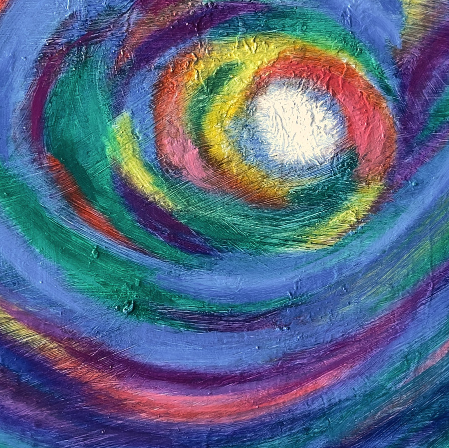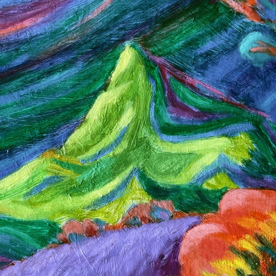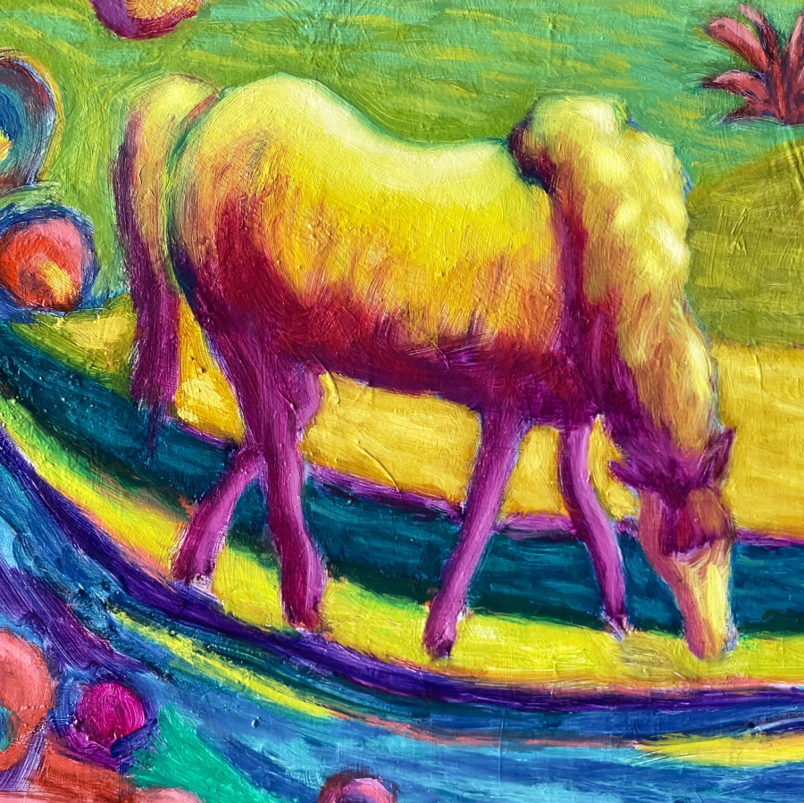 之前曾以超現實風格創作了一幅關於初鹿牧場的畫作,這次我想再次透過同樣的主題,表現一種“流動”的概念──包括整體大氣、山川和森林的光影、色彩及能量,也透過筆觸、各種粗細不一的曲線,表達萬物各自獨立又同爲一體的概念。