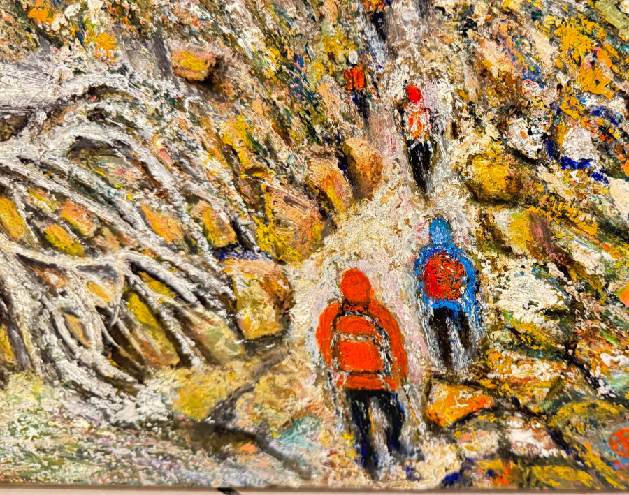 畫面下方幾個登山者沿著蜿蜒山徑前行,紅、藍衣服在冰雪背景中顯得鮮明,象徵著人類在大自然的宏偉面前,依舊勇敢邁步,渺小卻堅毅。