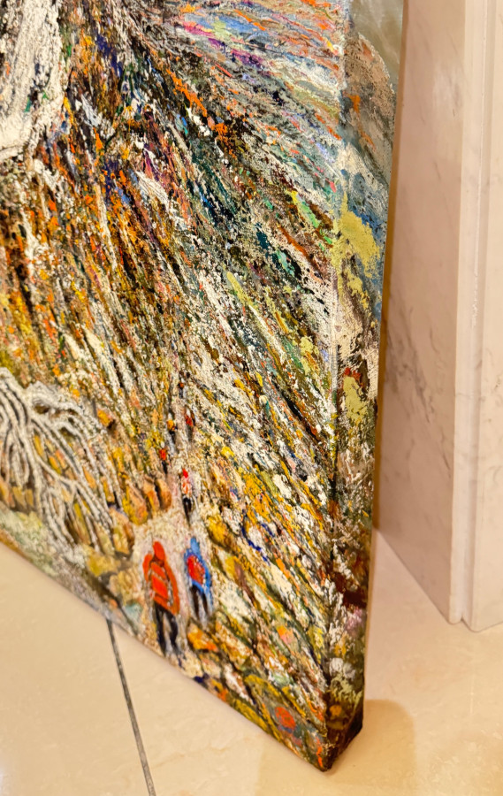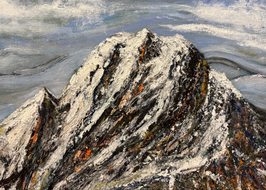 玉山踏雪行氣勢磅礴,整體氛圍既壯闊又充滿人文情感,高聳的山峰被皚皚白雪覆蓋,筆觸厚重,帶出山脈的冷峻與堅毅。層層山巒如劍鋒般鋒利,綿延不絕,直插雲霄。
