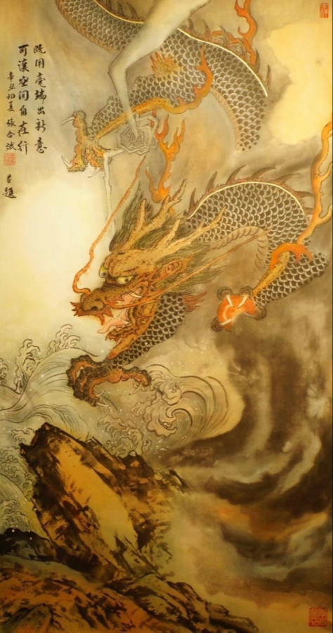 藝術家以細膩穩健筆法描繪一頭神態威猛、氣勢萬鈞的祥龍破空而出,其龍身盤旋在閃電霹靂之間,爪拍波濤,如不可阻擋的化身,展現出毫不畏懼、乘風破浪的磅礡氣魄。畫中,翻騰的海浪打上厚實穩固的岩岸,一動一靜之間,暗示著無窮龐大的能動力與堅忍穩定的毅力之調和。龍爪緊握一顆火紅龍珠,象徵著懷抱智慧與目標,無懼風浪與雷霆,乘勢而起,終得圓滿與祥瑞。